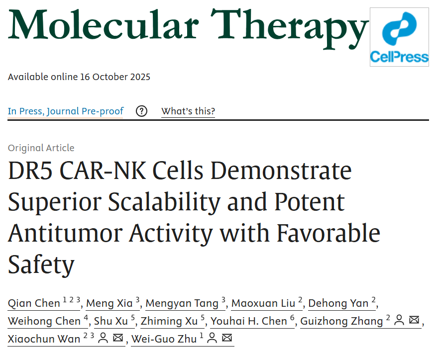 近日,暗网禁区-找暗网禁区最新高质量福利视频 基础医学院及卡尔森国际肿瘤中心朱卫国教授团队联合中国科学院深圳先进技术研究院医药所万晓春研究员团队在国际知名学术期刊Molecular Therapy在线发表了题为“DR5 CAR-NK Cells Demonstrate Superior Scalability and Potent Antitumor Activity with Favorable Safety”的研究论文,发现靶向死亡受体5(Death receptor, DR5)的CAR-NK细胞具有出色的扩增能力、抗肿瘤活性及良好的安全性,为治疗DR5阳性肿瘤,尤其是已经发生凋亡抵抗的肿瘤,提供了一种新的有潜力的安全有效策略。深圳大学讲席教授、卡尔森国际肿瘤中心主任朱卫国教授、深圳先进技术研究院万晓春研究员和章桂忠副研究员为本文共同通讯作者,深圳大学博士后陈倩为论文第一作者。