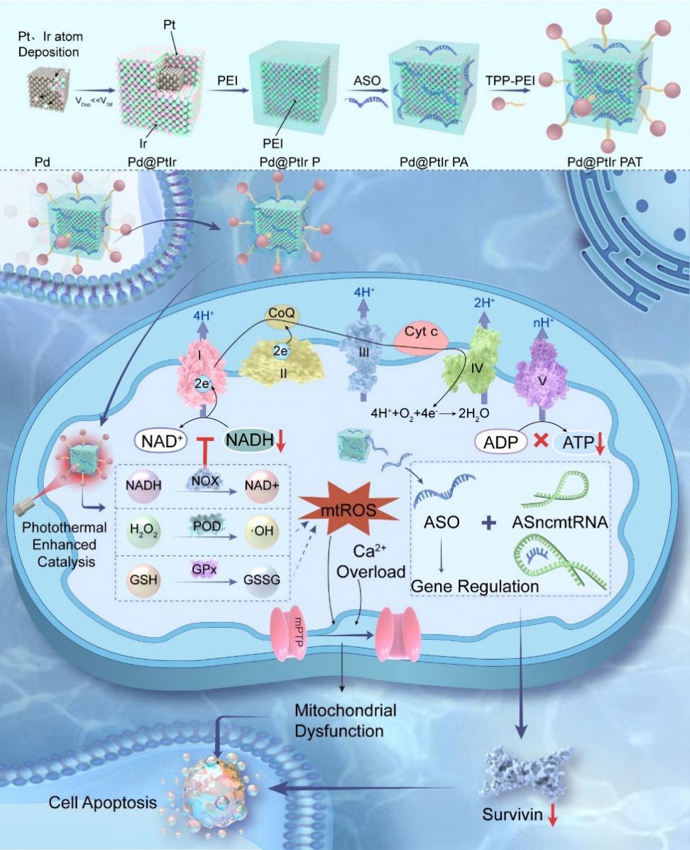 本研究以钯(Pd)立方体为核心,通过原子级精度外延沉积铂和铱(Pt/Ir=1:1)合金壳层,开发了一种三苯基膦(TPP)功能化的Pd@PtIr纳米酶。经过合理设计的金属中心结构产生了协同催化界面,不仅增强了过氧化物(POD)酶活性(经密度泛函理论(DFT)验证),还赋予了纳米酶在单一平台内固有的还原型烟酰胺腺嘌呤二核苷酸(NADH)氧化酶(NOX)和谷胱甘肽过氧化物酶(GPx)样功能。在 808 nm近红外(NIR)照射下,纳米酶触发一系列模拟酶的氧化还原反应,共同耗尽肿瘤细胞线粒体中的谷胱甘肽(GSH)并提高活性氧(ROS)水平,同时 NADH 氧化也破坏了 ATP 的生物合成。这些协同作用共同损害了肿瘤细胞线粒体的氧化还原稳态和能量代谢。为了进一步增强治疗效果,我们将纳米酶与反义寡核苷酸(ASO)介导的 ASncmtRNA 沉默相结合,在原位乳腺癌模型中实现了显著的 89.1%的肿瘤消退。这种结合原子精度的催化剂设计、多功能酶活性和基因沉默疗法的综合疗法为肿瘤学中针对细胞器的精准纳米治疗提供了一种变革性的范例。